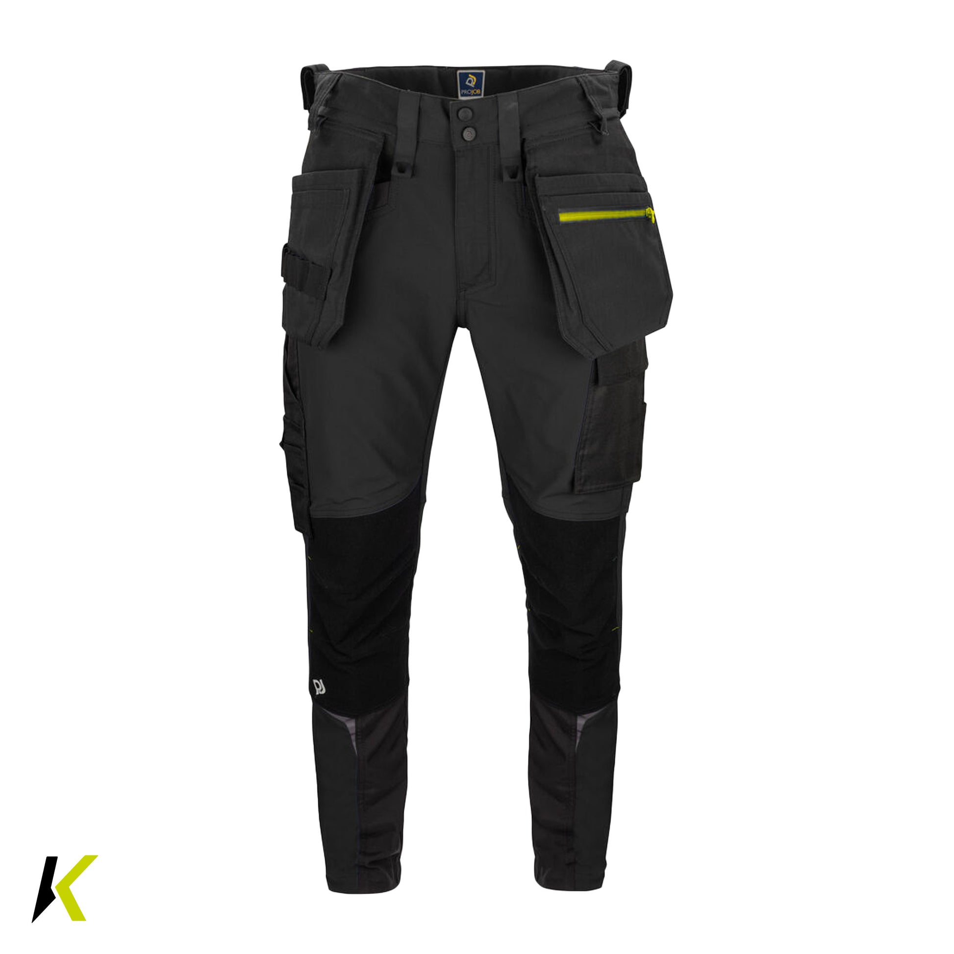 Modern geschnittene Full Stretch Arbeitshose mit Hängetaschen in Ripstop Polyester-Baumwollmischung. 4 Wege Stretch im Gesäß-, Schritt- und Oberschenkelbereich. 2 Wege Stretch in der Kniekehle und im Wadenbereich. Lüftungsöffnungen mit Reißverschluss und Mesh entlang beider Beine. Elastischer Mesheinsatz am Hosenbund erhöht den Tragekomfort. Zwei Hammerschlaufen. Linkes Bein eine Cargotasche mit Unterteilungen für Schreibutensilien und Handy mit Magnet verschliessbar. Am rechten Bein eine aufgenähte Metertasche mit weiteren Unterteilungen für Werkzeug. Reflektierende Details für erhöhte Sichtbarkeit in der Dunkelheit. Regulierbare Beinabschlüsse. Vorgeformte Knie sind mit DuPont Stretch-Kevlar verstärkt. Hängetaschen und untere Innenseite der Beine sind mit Cordura verstärkt. Gesäßtaschen sind in Cordura gearbeitet.
